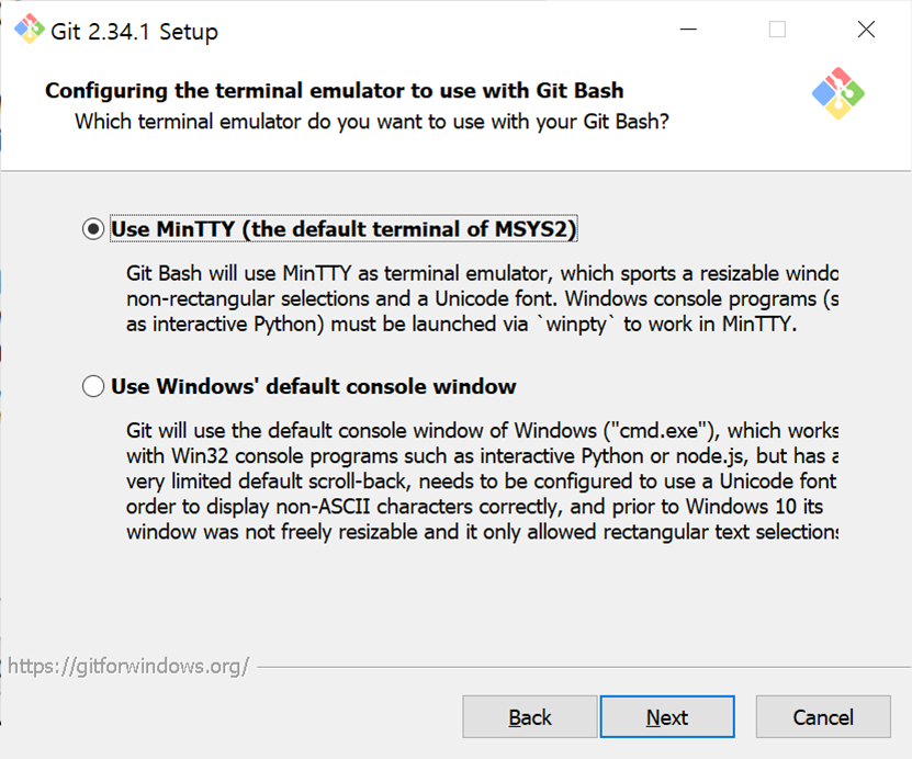다음으로 Use MinTTY를 선택하고 Next를 눌러줍니다.
