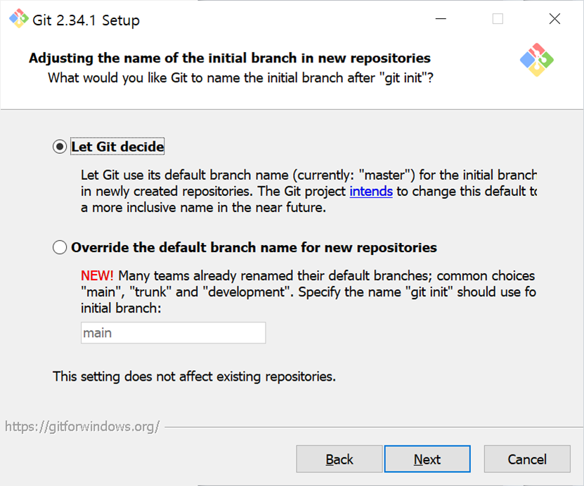 다음으로 initial branch name 선택하고 Next를 눌러줍니다.