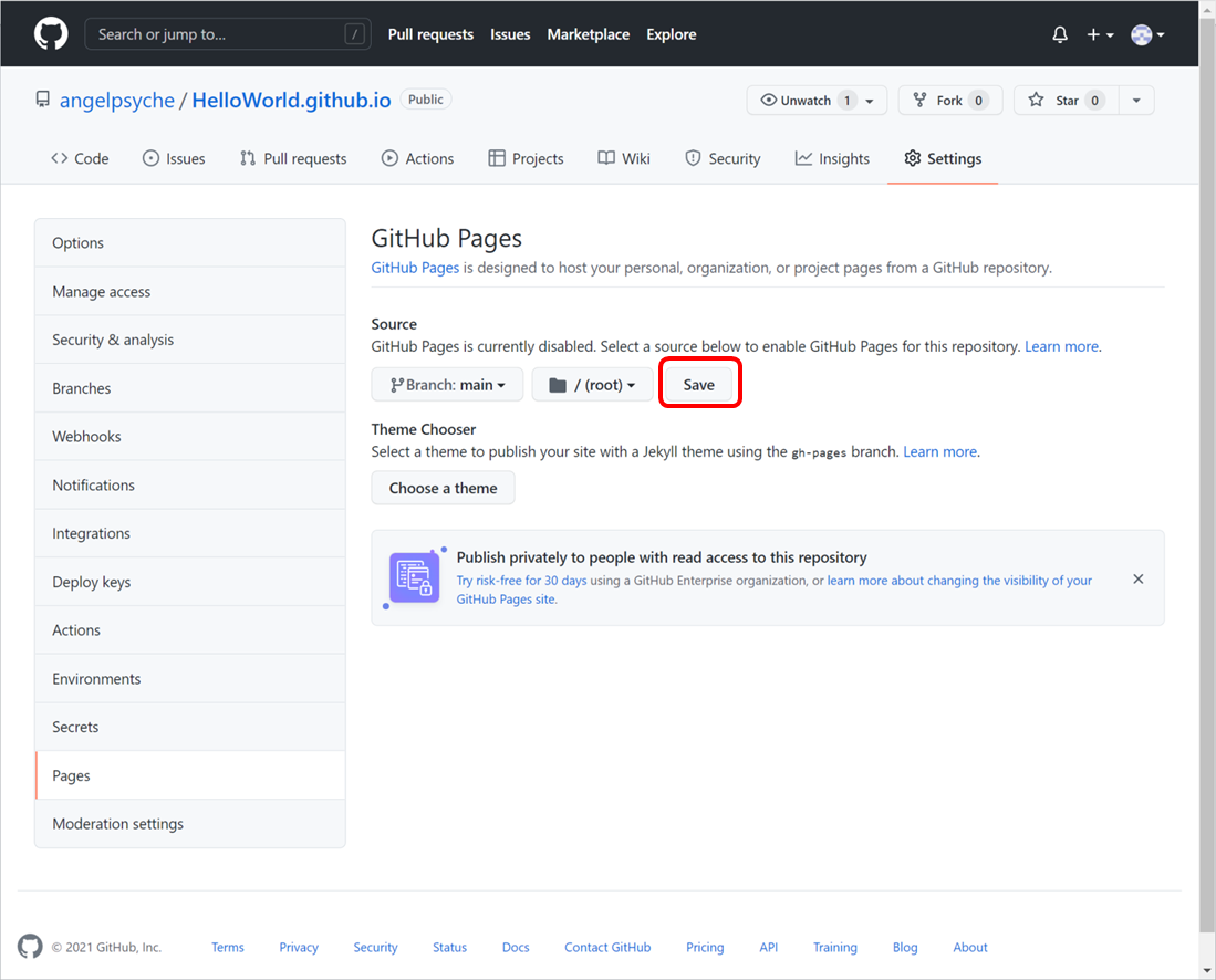 Settings화면에서 아래로 내려 GitHub Pages로 이동하고 Check it out here!를 클릭합니다.