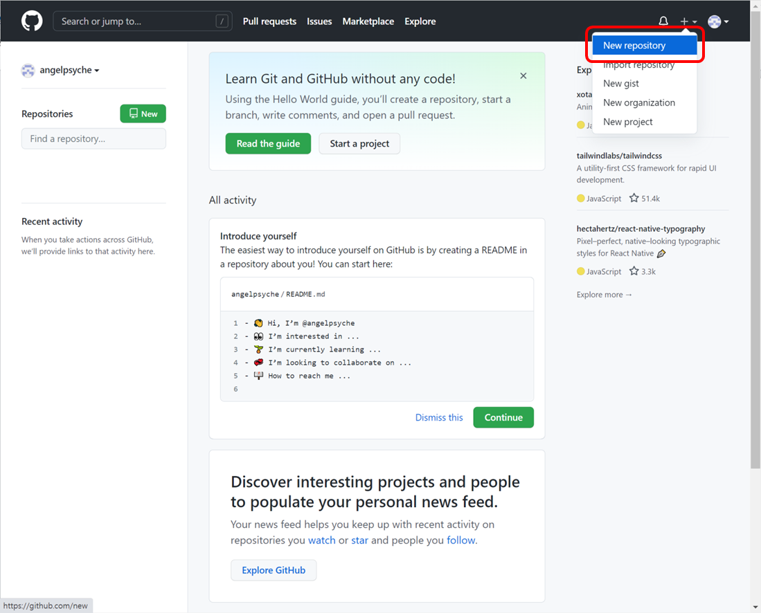 다음으로 New repository를 생성하겠습니다. 아래의 그림과 같이 +를 눌러 New repository를 선택합니다.