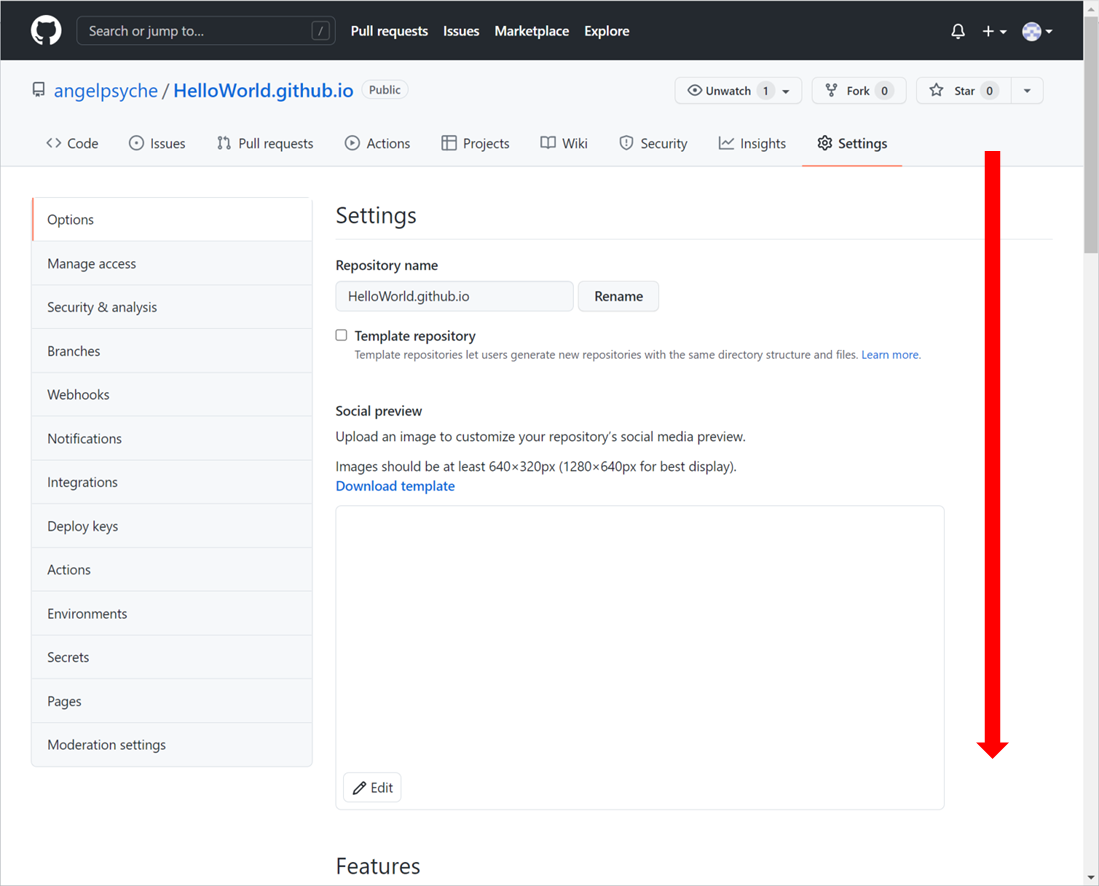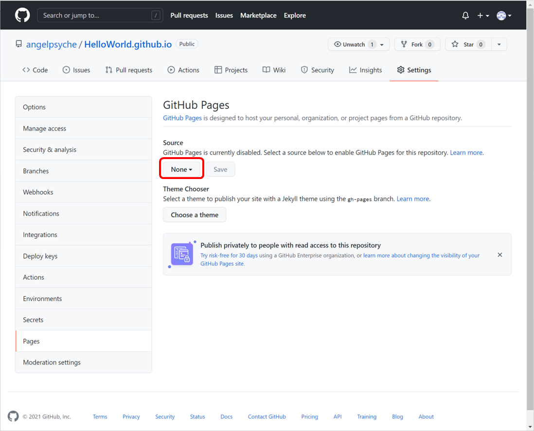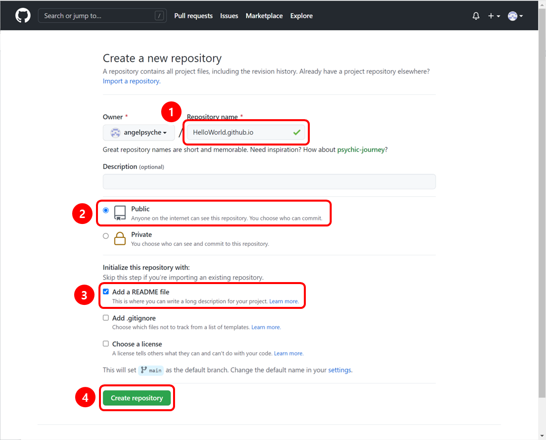다음으로 1. Repository name에는 HelloWorld.github.io로 입력하고