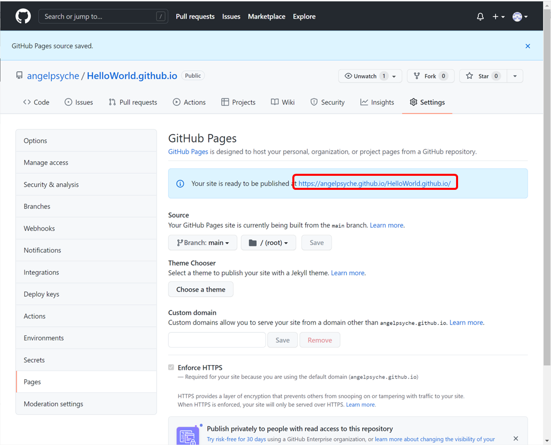 아래의 그림과 같이 GitHub Pages에 해당 repository의 URL이 나타나게 됩니다.