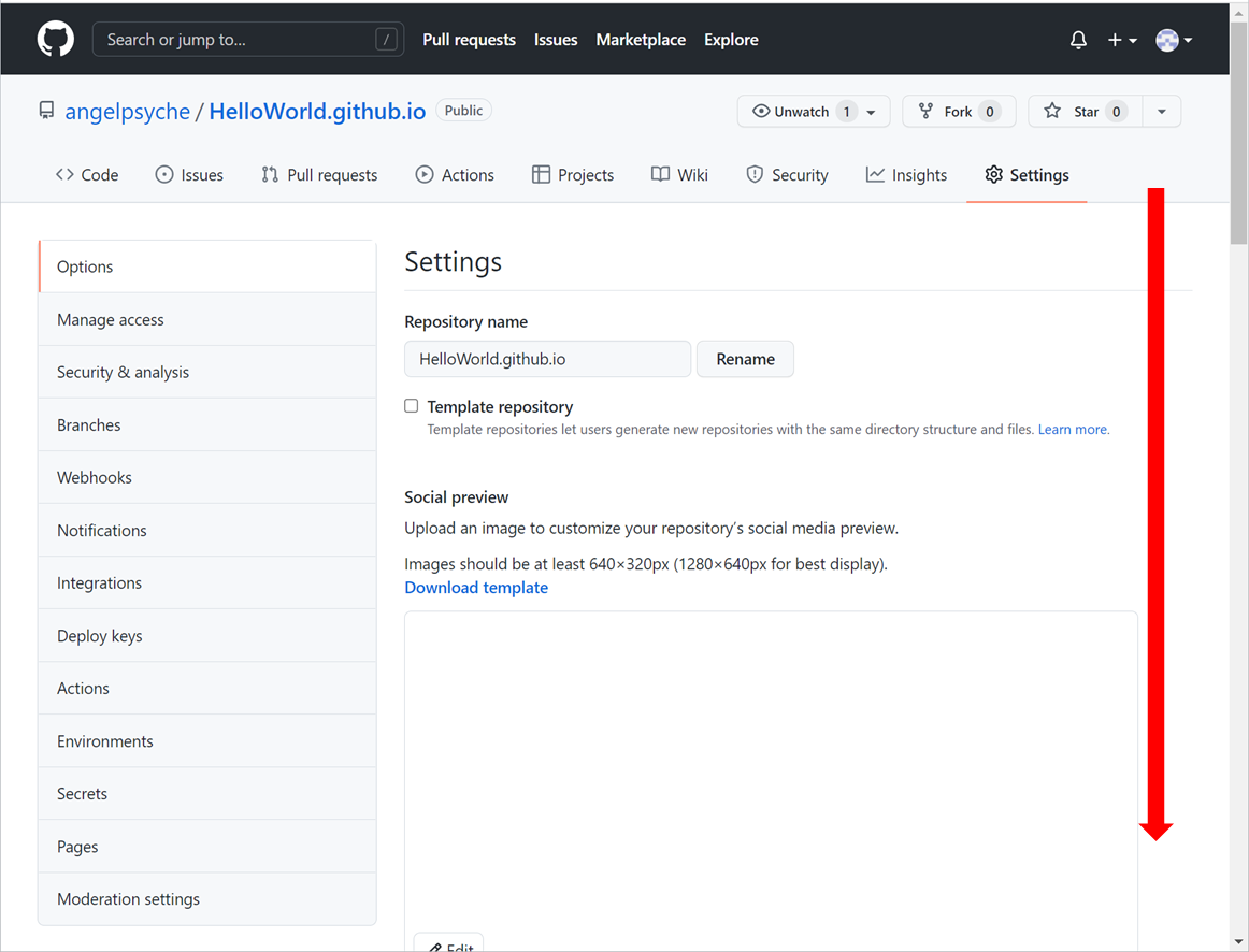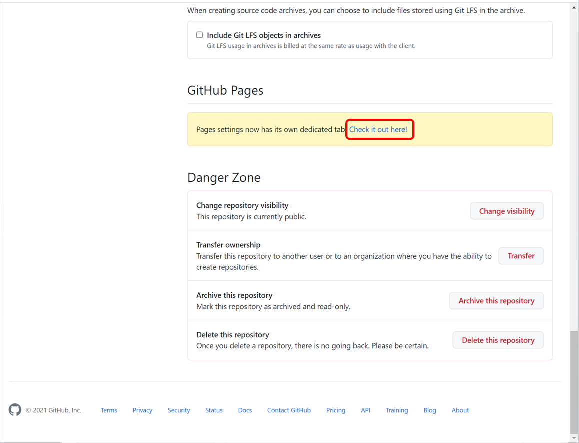 Settings 화면에서 아래로 내려 GitHub Pages로 이동하고 Check it out here!를 클릭합니다.