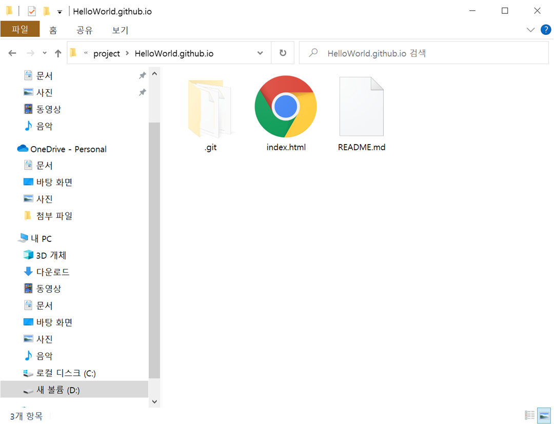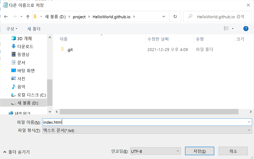D:\project\HelleWorld.github.io폴더에 index.html 파일로 저장합니다.
