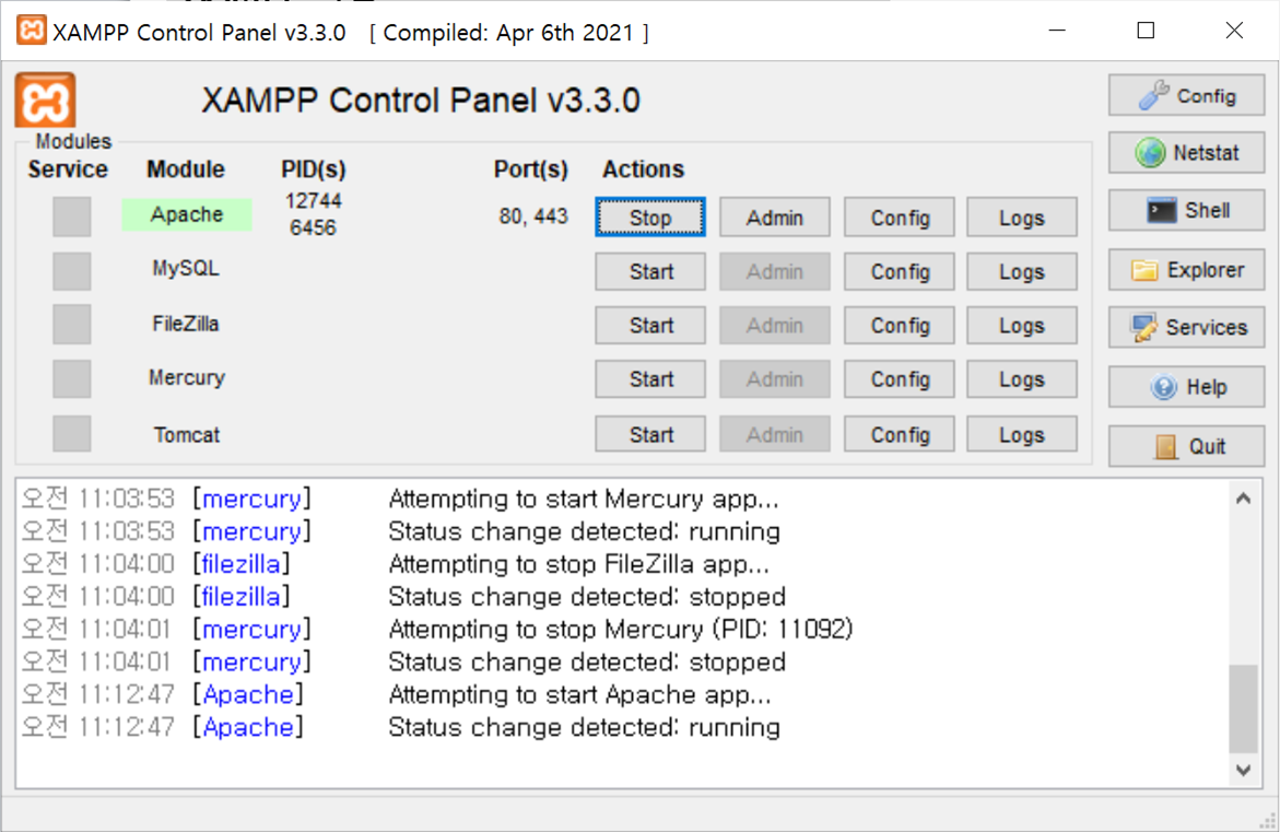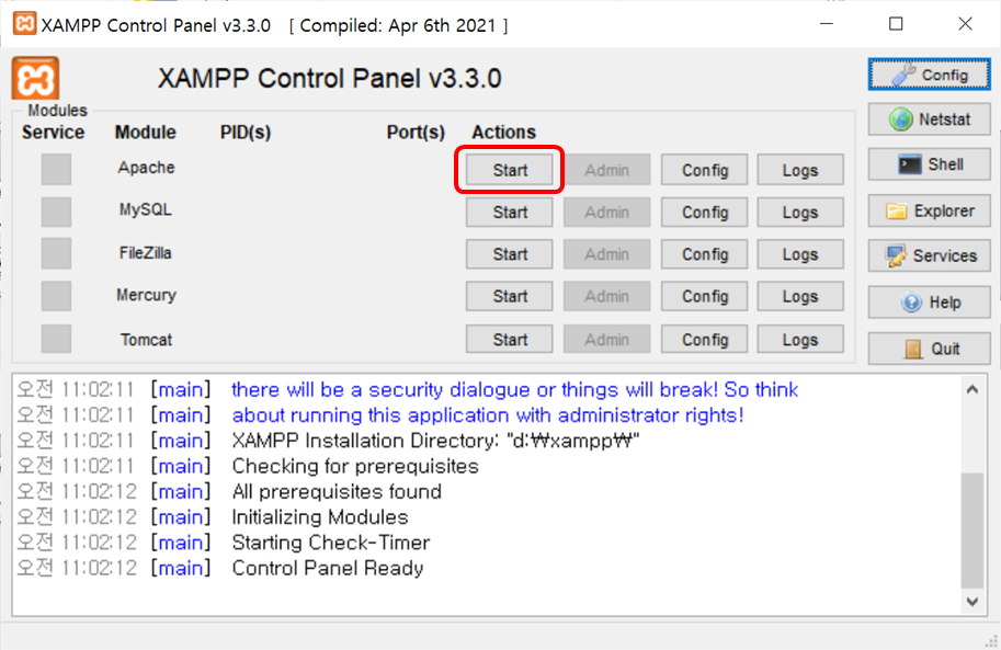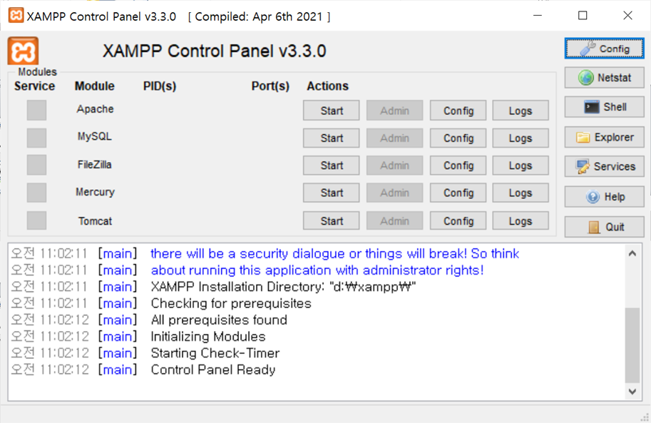 그럼 XAMPP Control Panel 창이 뜨게 됩니다.