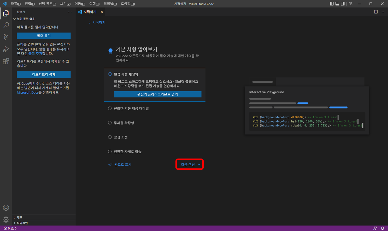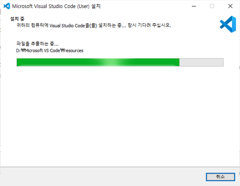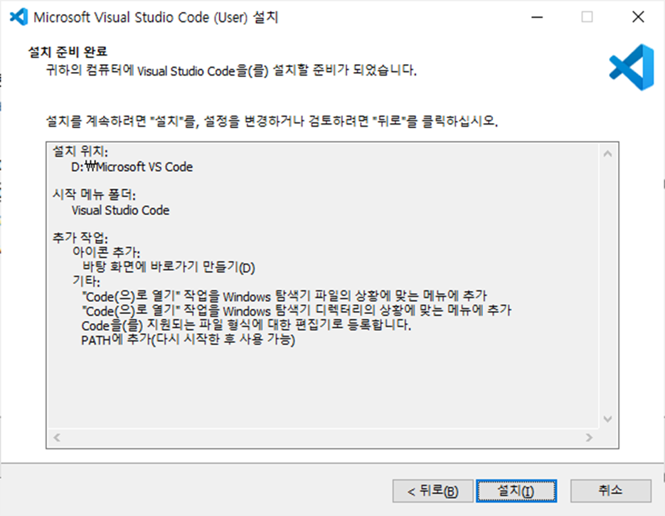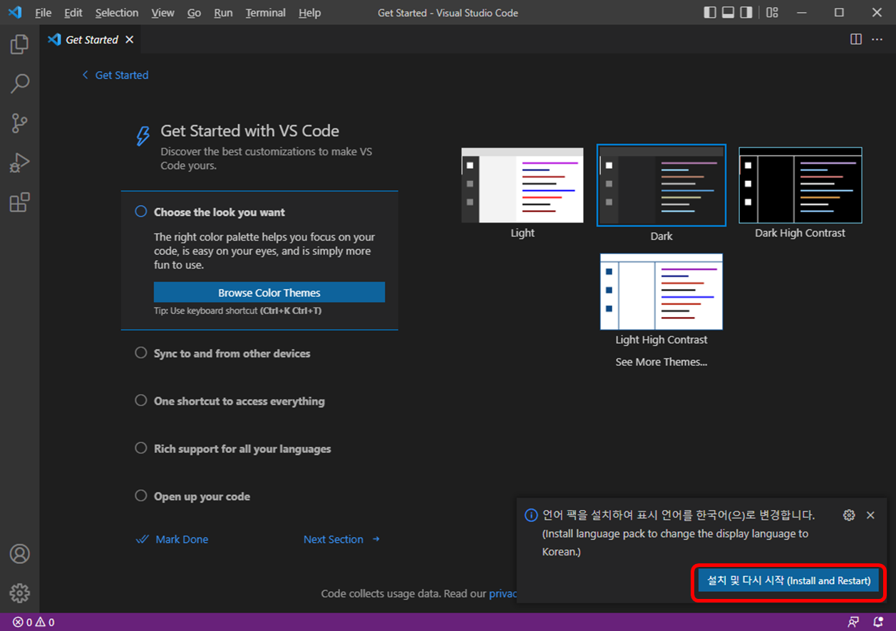 설치 및 다시 시작 버튼을 눌러 비주얼 스튜디오 코드를 다시 실행 시켜줍니다.