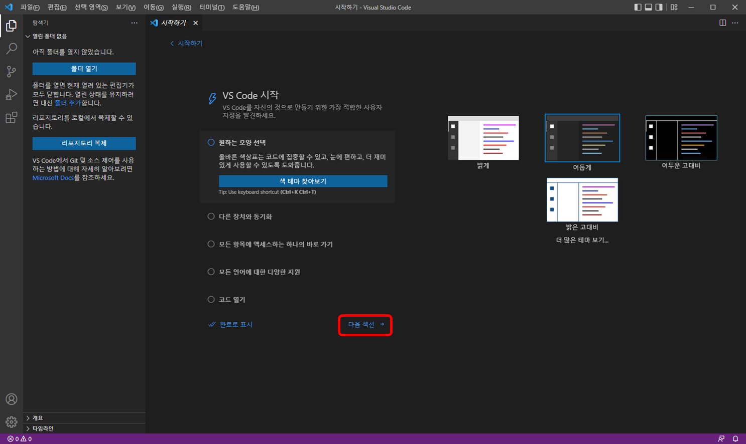 원하는 테마를 선택한다음 다음 섹션 버튼을 눌러줍니다.