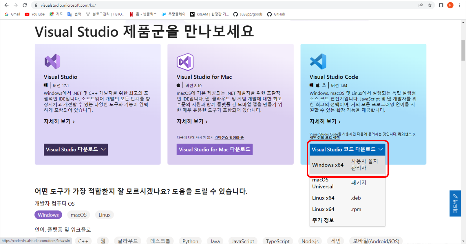먼저 Visual Studio Code을 다운로드하기 위해 아래의 URL 주소로 이동합니다.