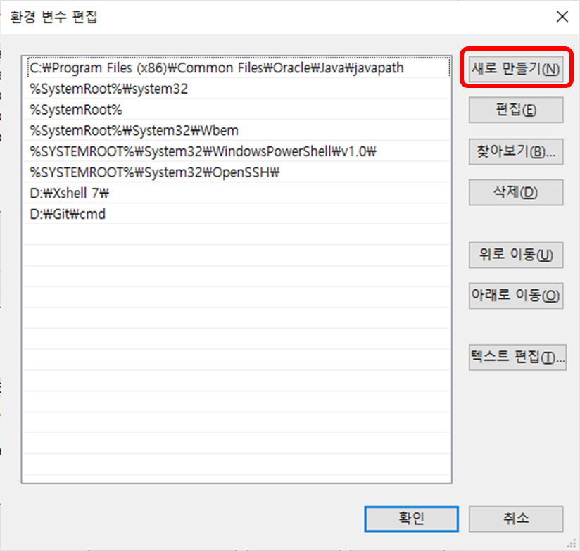 환경 변수 편집에서 새로 만들기(N) 버튼을 눌러줍니다.