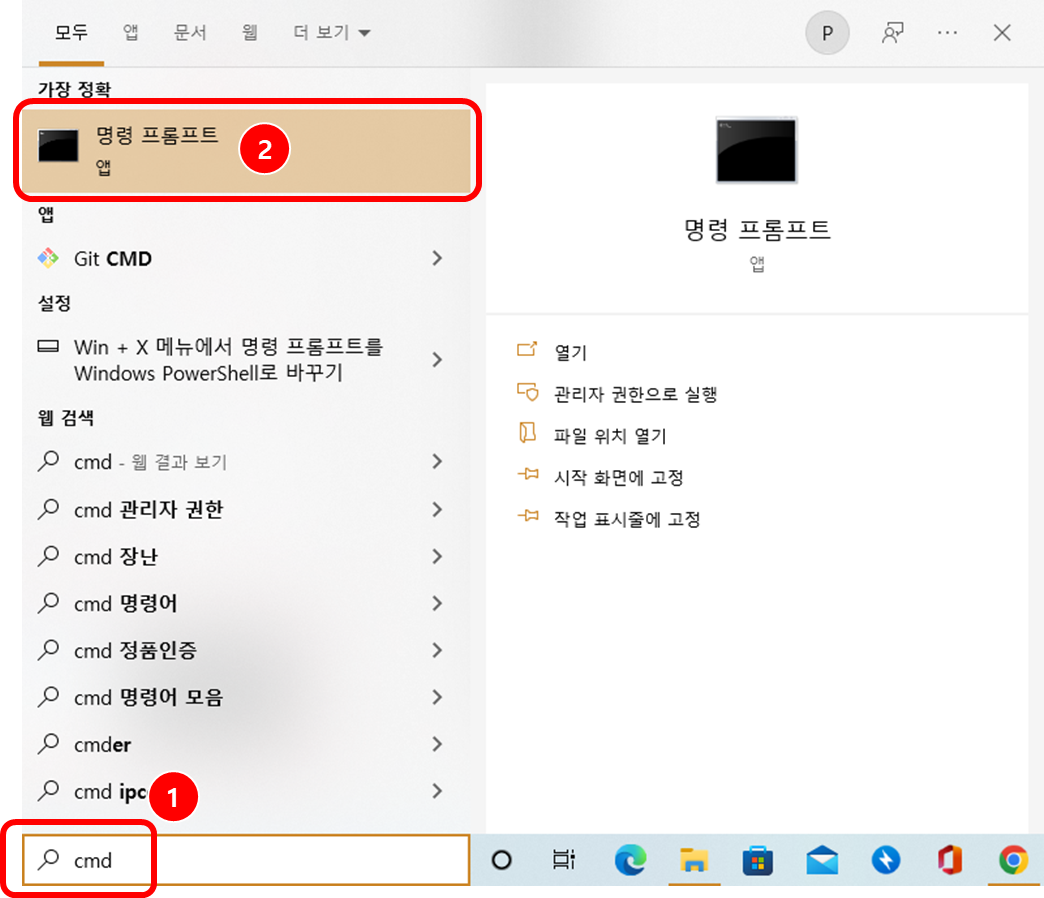 1. cmd를 입력하여 명령 프롬프트를 실행 시켜줍니다.