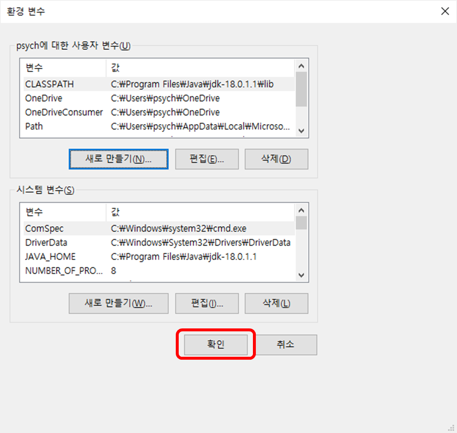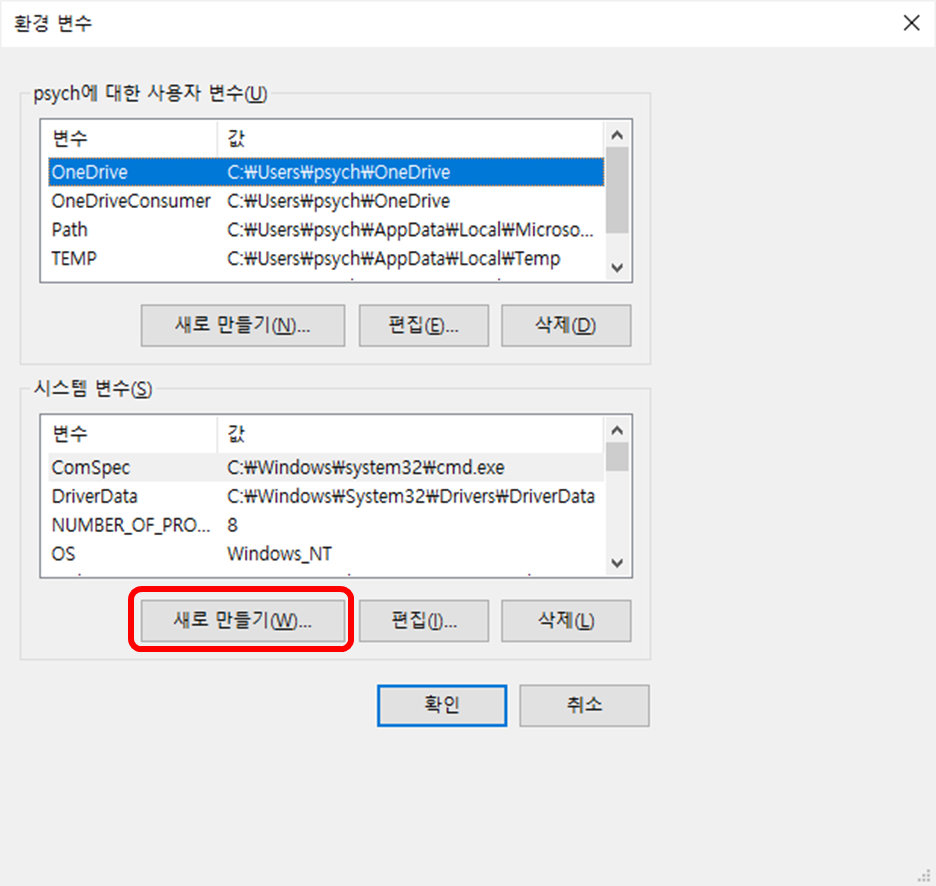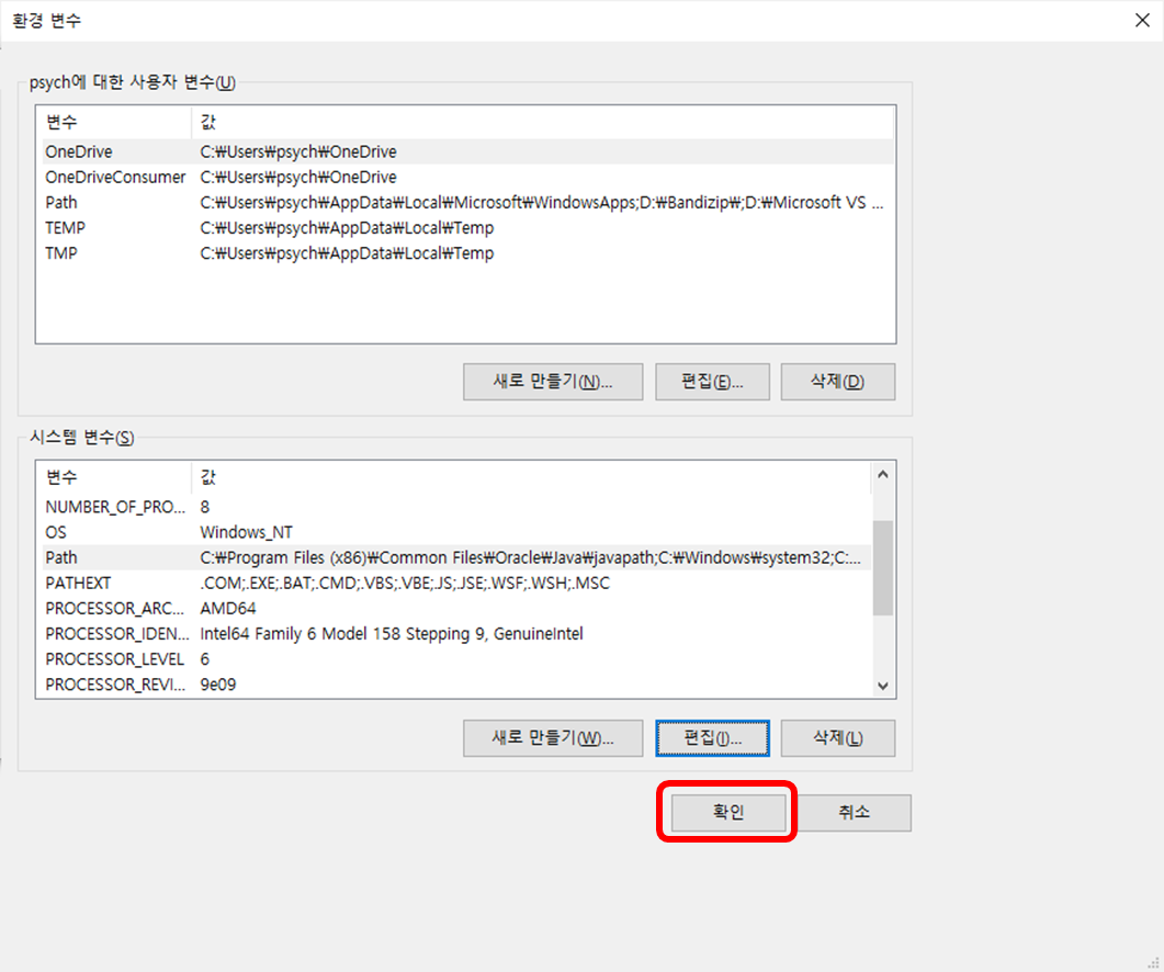 그럼 환경 변수 창으로 돌아오고 다시 확인 버튼을 눌러줍니다.