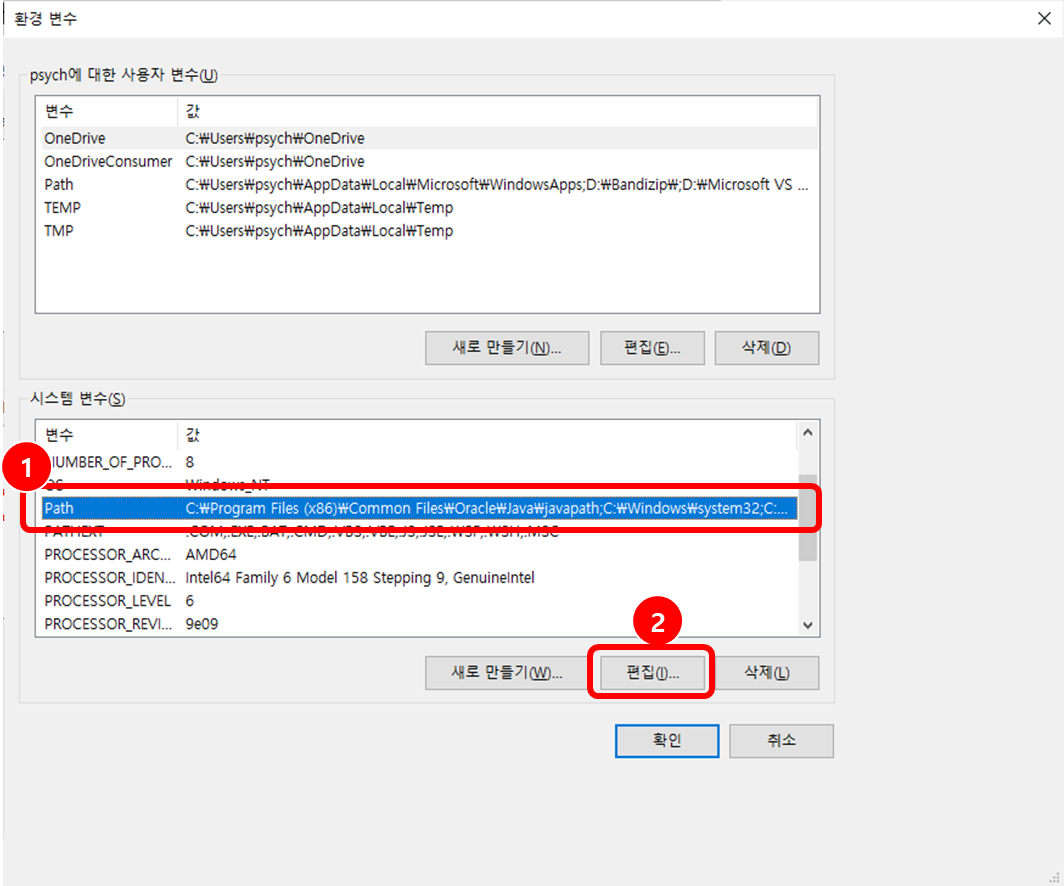시스템 변수 탭에서 Path 변수를 찾아 편집(I) 버튼을 눌러줍니다.