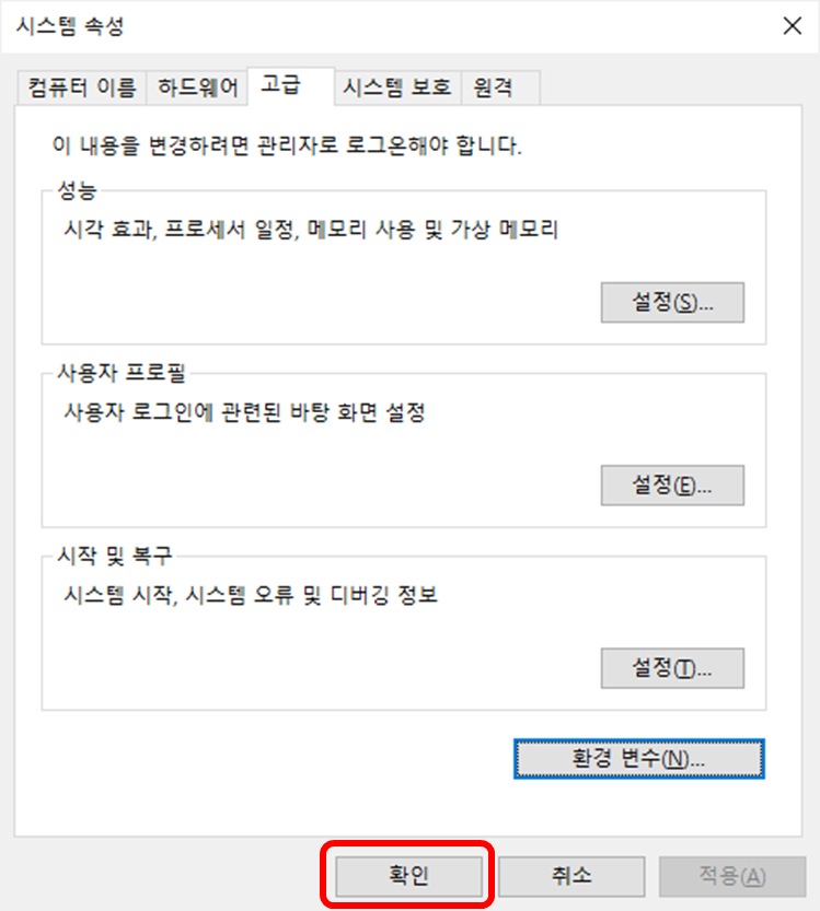 그럼 시스템 속성 창으로 돌아오고 다시 확인 버튼을 눌러줍니다.