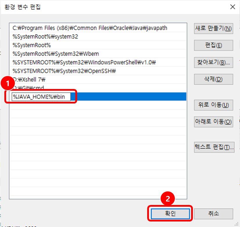 환경 변수 값으로 %JAVA_HOME%\bin을 입력하고 확인 버튼을 눌러줍니다.
