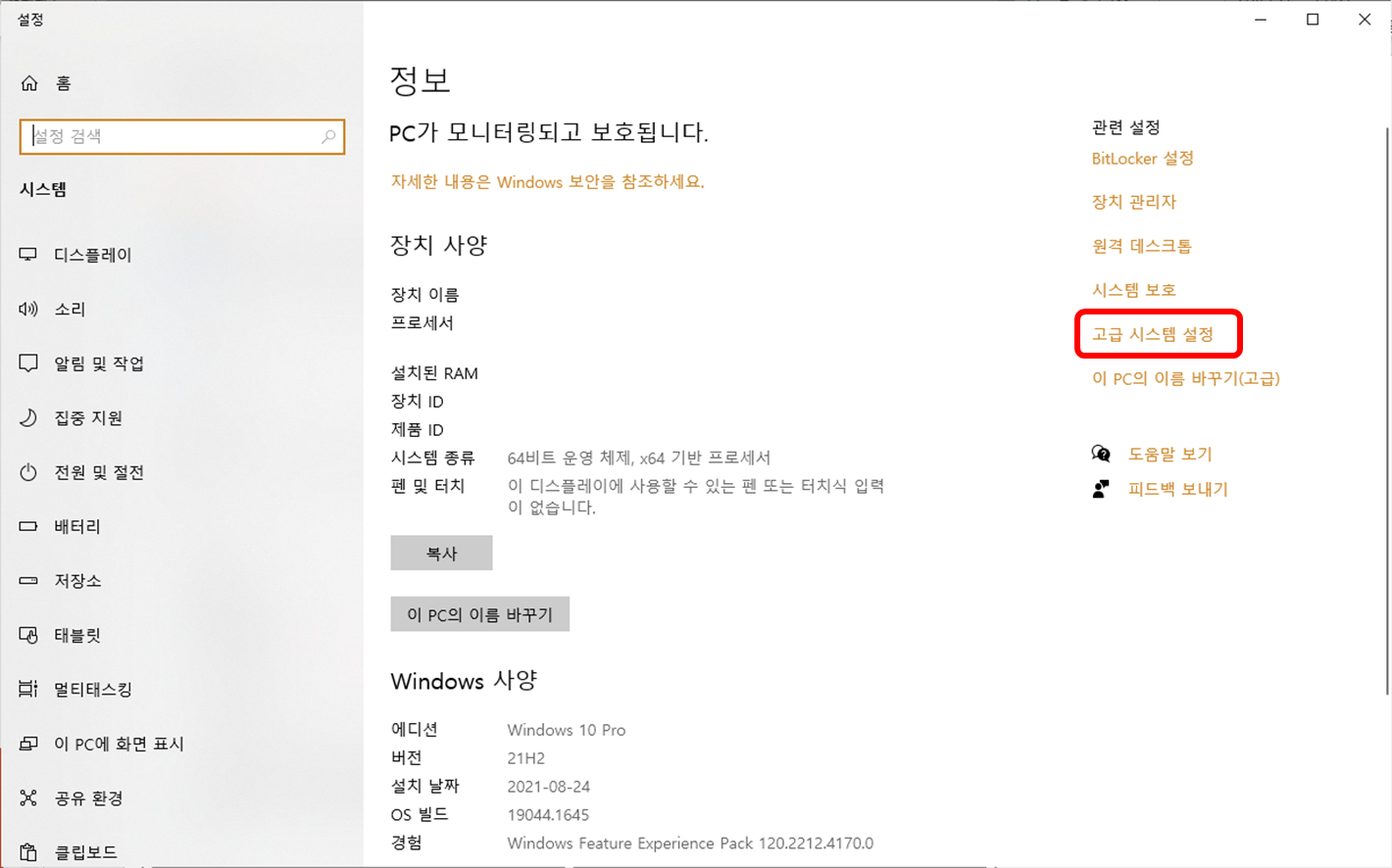 시스템 설정에서 고급 시스템 설정을 눌러주고