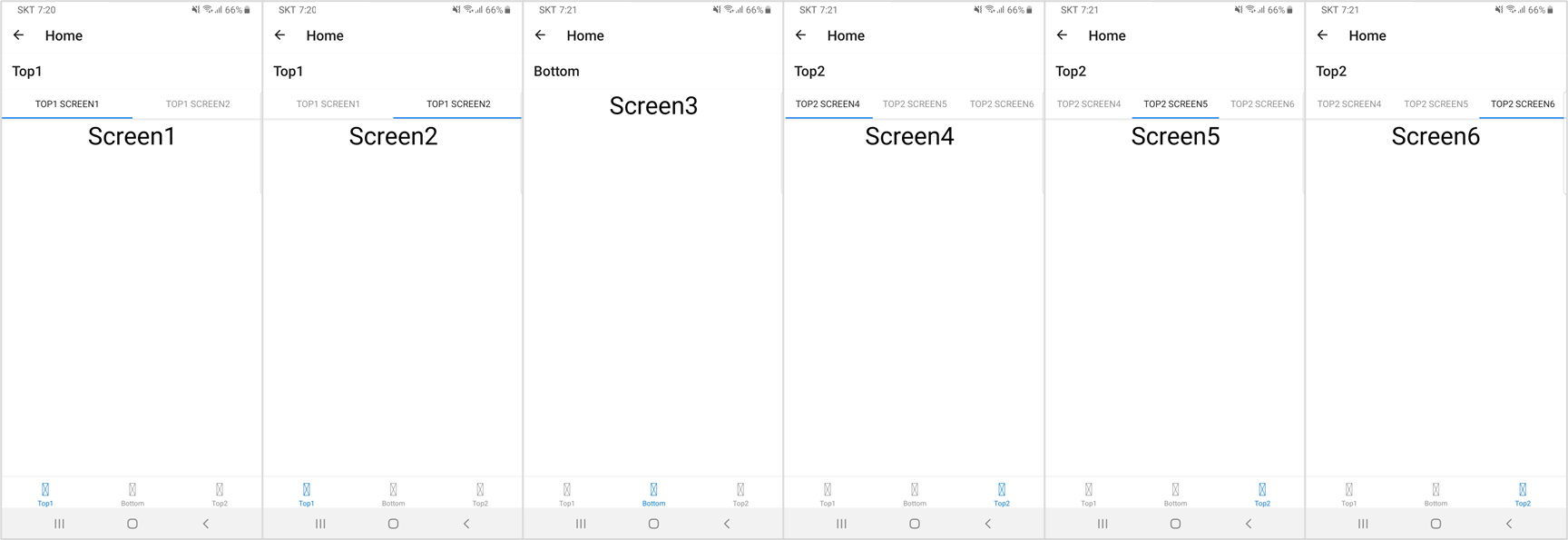 홈 화면에서 Top-Tab과 Bottom-Tab으로 구성된 화면들입니다.