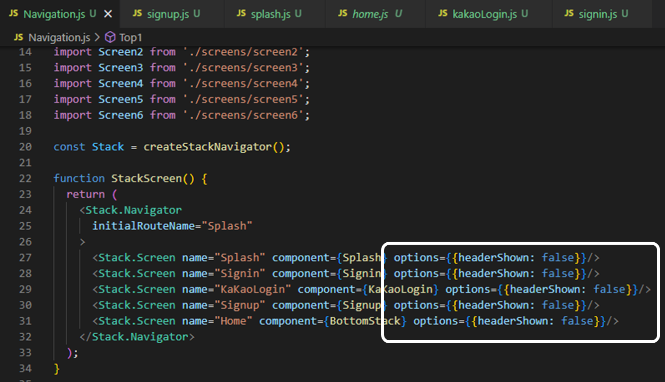 <Stack.Screen name="KaKaoLogin" component={KaKaoLogin} options={{headerShown: false}}/>