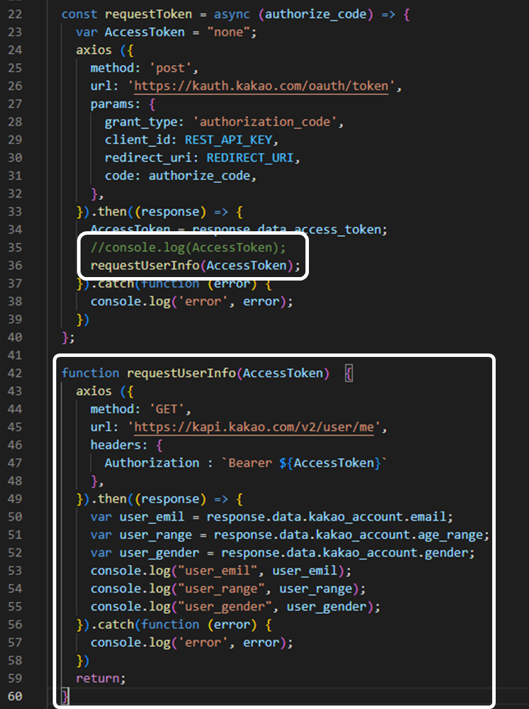 먼저 지난 kakaoLogin.js 코드에서 AccessToken을 console.log로 찍어보았습니다.